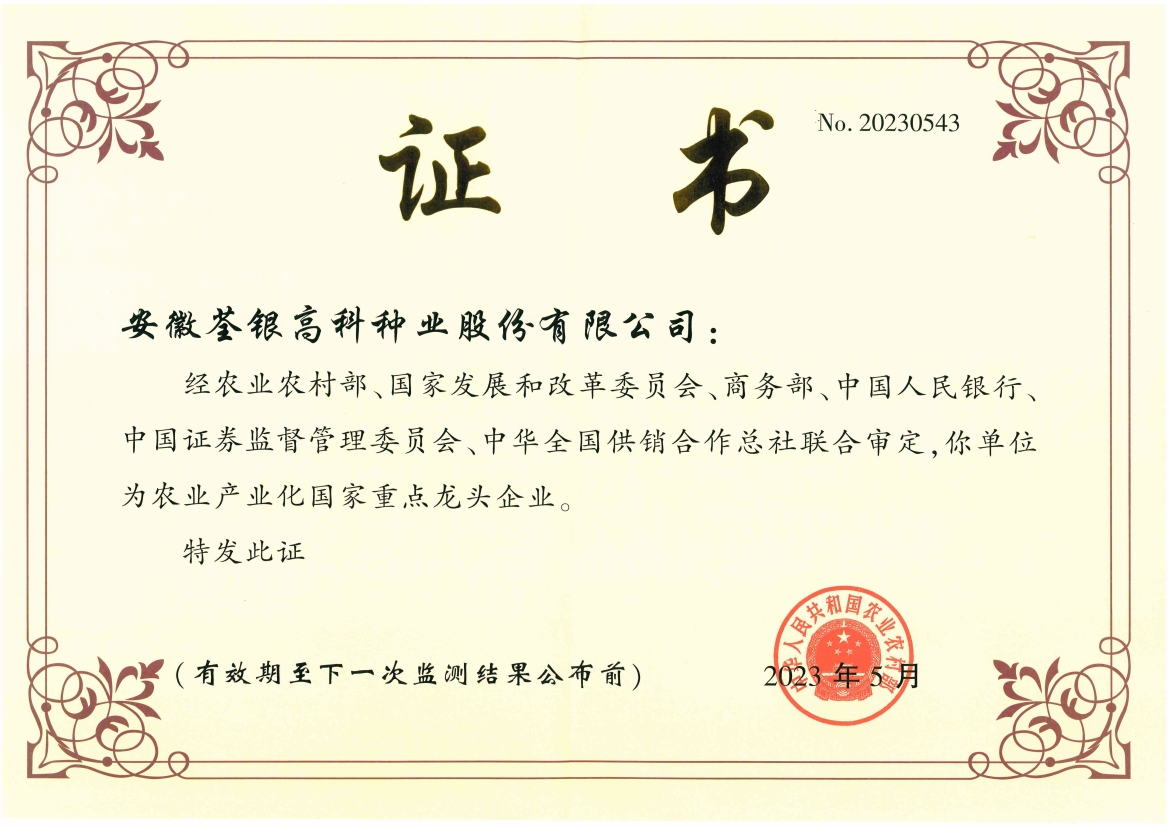 安徽荃銀高科種業(yè)股份有限公司是一家“以種業(yè)為核心、農(nóng)業(yè)服務(wù)為延伸、探索和創(chuàng)新農(nóng)業(yè)多元化發(fā)展”的現(xiàn)代高科技種業(yè)上市公司,證券代碼:300087。公司注冊資金9.47億元,系“中國種業(yè)領(lǐng)軍企業(yè)、農(nóng)業(yè)產(chǎn)業(yè)化國家重點(diǎn)龍頭企業(yè)、國家高新技術(shù)企業(yè)、農(nóng)業(yè)部首批農(nóng)作物種子育繁推一體化企業(yè)、中國種業(yè)信用明星企業(yè)"。在國內(nèi)控股子公司20多家,在國外設(shè)立分支機(jī)構(gòu)4家,良種銷售至全國20多個(gè)?。ㄊ小^(qū)),出口覆蓋20多個(gè)國家與地區(qū),種業(yè)綜合實(shí)力、雜交水稻研發(fā)、推廣及海外業(yè)務(wù)規(guī)模均居全國種子企業(yè)前2位。